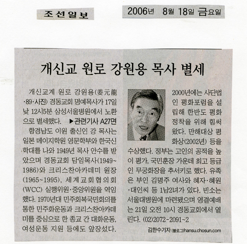 개신교 원로 강원용 목사 별세 (여해사업회014) 작성일 : 2011.06.29 조회수 : 17 공유하기 페이스북으로 공유하기 페이스북으로 공유하기 URL 1970년대 민주회복국민회의를 통한 민주화운동과 크리스챤아카데미를 중심으로 한 종교간 대화운동, 여성운동 지원 등에 앞장서 온 강원용 경동교회 명예목사가 17일 낮 12시 5분 삼성서울병원에서 노환으로 별세했다. 관련일시 2006.08.18 노트 조선일보 태그 신문기사 이전 한신대 신입생을 위한 내일&리더십 캠프 다음 1차 멘토 포럼 목록으로