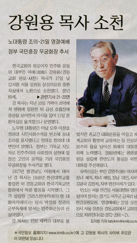 강원용 목사 소천 (여해사업회016-1) 작성일 : 2011.06.29 조회수 : 18 공유하기 페이스북으로 공유하기 페이스북으로 공유하기 URL "“노대통령 조의... 21일 영결예배”강원용 목사는 진보세력의 대부로 불렸지만 세계교회와 활발히 교류하는 등 진보와 보수의 틀을 넘어선 화해와 대화를 위해 노력했다." 관련일시 2006.08.18 노트 국민일보 태그 신문기사 이전 한신대 신입생을 위한 내일&리더십 캠프 다음 1차 멘토 포럼 목록으로