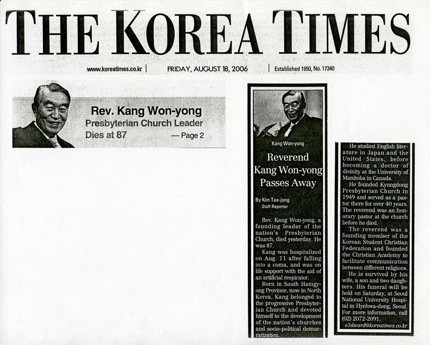 Reverend Kang Won-yong Passes Away (여해사업회032) 작성일 : 2011.06.29 조회수 : 16 공유하기 페이스북으로 공유하기 페이스북으로 공유하기 URL 관련일시 2006.08.18 노트 TheKoreaTimes 태그 신문기사 이전 한신대 신입생을 위한 내일&리더십 캠프 다음 1차 멘토 포럼 목록으로
