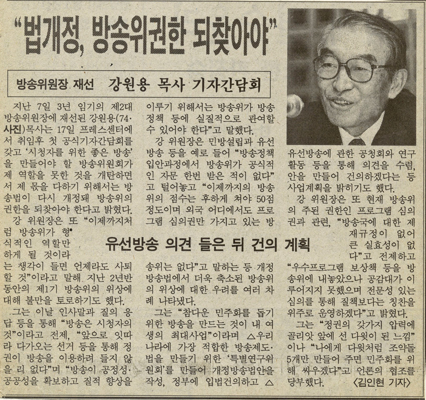 방송위원장 재선 강원용 목사 기자간담회 작성일 : 2011.06.29 조회수 : 18 공유하기 페이스북으로 공유하기 페이스북으로 공유하기 URL 지난 7일 3년 임기의 제2대 방송위원장에 재선된 강원용 목사는 17일 프레스센터에서 취임후 첫 공식기자간담회를 갖고 ‘시청자를 위한 좋은 방송’을 만들어야 할 방송위원회가 제 역할 못한 것을 개탄하면서 제몫을 다하기 위해서는 방송법이 다시 개정돼 방송위의 권한을 되찾아야 한다고 밝혔다. 노트 한겨레 태그 신문기사 이전 한신대 신입생을 위한 내일&리더십 캠프 다음 1차 멘토 포럼 목록으로