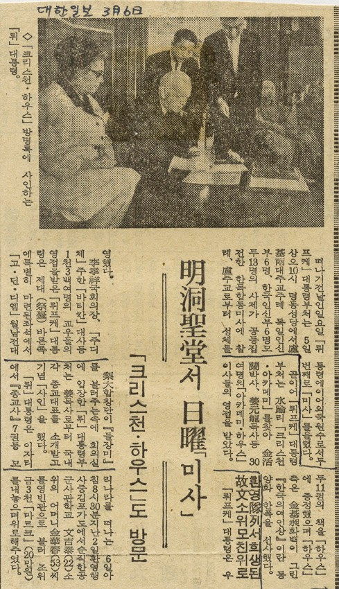 명동성당서 일요미사 등_독일 뤼프케 대통령 작성일 : 2011.06.29 조회수 : 21 공유하기 페이스북으로 공유하기 페이스북으로 공유하기 URL 명동성당에서의 미사를 마친 뤼프케 대통령 부처는 수유리 크리스챤아카데미를 찾아 김활란 박사, 강원용 목사 등 30여 명의 아카데미하우스 이사들의 영접을 받았다. 관련일시 1967.03.06 노트 대한일보 태그 신문기사 이전 한신대 신입생을 위한 내일&리더십 캠프 다음 1차 멘토 포럼 목록으로