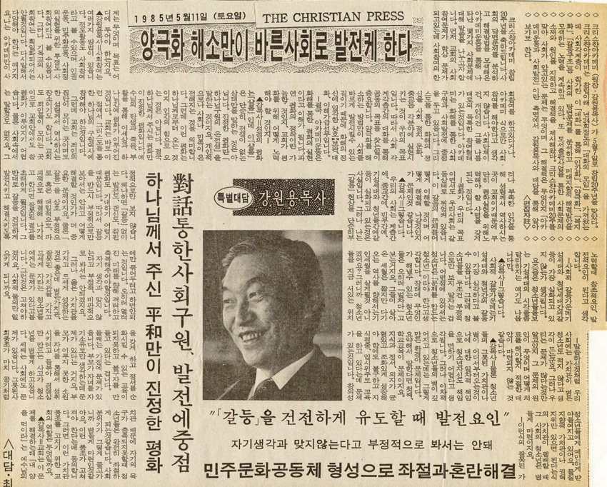 강원용 목사 특별대담: 양극화 해소만이 바른 사회로 발전케 한다. 작성일 : 2011.06.29 조회수 : 24 공유하기 페이스북으로 공유하기 페이스북으로 공유하기 URL 크리스챤아카데미가 5월7일로 창립20주년을 맞았다. 크리스챤아카데미는 창립 이래 연24회 정도의 대화모임을 가져왔는데 사회 각계각층이 참가한 이 대화를 통해 인간화, 양극화, 복지화, 갈등구조 등 사회의 당면 문제를 분석하고 미래지향적 해결방안을 모색하는 노력을 계속하고 있다. 관련일시 1985.05.11 노트 크리스챤신문 태그 신문기사 이전 한신대 신입생을 위한 내일&리더십 캠프 다음 1차 멘토 포럼 목록으로