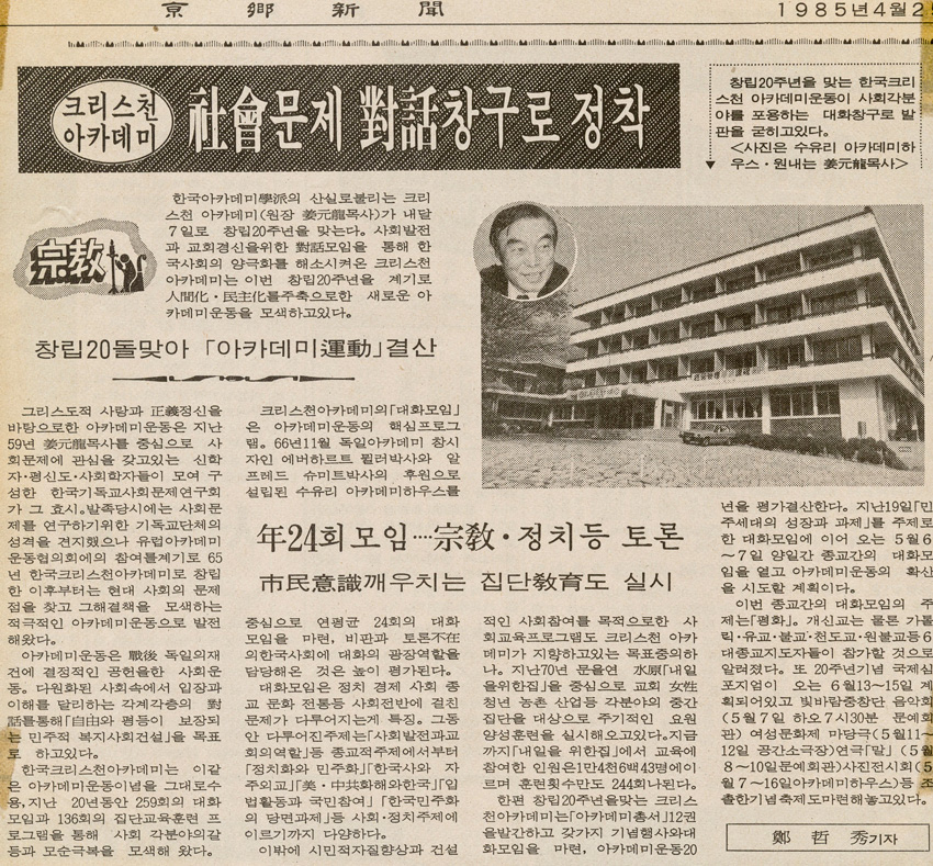 크리스챤아카데미, 사회문제 대화창구로 정착 작성일 : 2011.06.29 조회수 : 20 공유하기 페이스북으로 공유하기 페이스북으로 공유하기 URL 한국 크리스챤아카데미는 자유와 평등이 보장되는 민주적 복지사회 건설의 아카데미 운동 이념을 통해 지난 20년 동안 259회의 대화모임과 136회의 집단교육훈련 프로그램을 통해 사회 각 분야의 갈등과 모순극복을 모색해 왔다. 관련일시 1985.04.25 노트 경향신문 태그 신문기사 이전 한신대 신입생을 위한 내일&리더십 캠프 다음 1차 멘토 포럼 목록으로