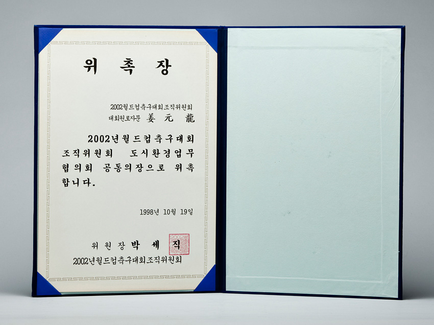 2002년 월드컵축구대회 조직위원회 도시환경업무협의회 공동의장 위촉장 작성일 : 2011.06.29 조회수 : 19 공유하기 페이스북으로 공유하기 페이스북으로 공유하기 URL 2002년 월드컵 축구대회 조직위원회 도시 환경업무 협의회 공동의장으로 위촉합니다. 관련일시 1998.10.19 태그 각종상패 이전 한신대 신입생을 위한 내일&리더십 캠프 다음 1차 멘토 포럼 목록으로