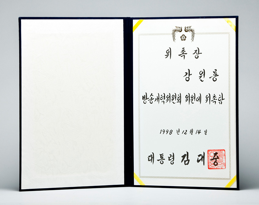방송개혁위원회 위원 위촉장. 김대중 대통령 작성일 : 2011.06.29 조회수 : 38 공유하기 페이스북으로 공유하기 페이스북으로 공유하기 URL 방송개혁위원회 위원에 위촉함 관련일시 1998.12.14 태그 각종상패 이전 한신대 신입생을 위한 내일&리더십 캠프 다음 1차 멘토 포럼 목록으로
