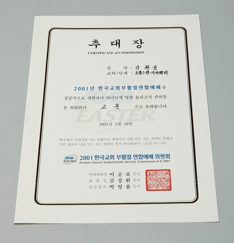 2001 한국교회 부활절연합예배위원회 고문 추대장 작성일 : 2011.06.29 조회수 : 54 공유하기 페이스북으로 공유하기 페이스북으로 공유하기 URL "2001년 한국교회 부활절 연합예배를 성공적으로 개최하여 하나님께 영광을 돌리고자 귀하를 본 위원회의 고문으로 추대합니다.“예수께서 가라사대 나는 부활이요 생명이니 나를 믿는 자는 죽어도 살겠고 무릇 살아서 나를 믿는 자는 영원히 죽지 아니하리니” (요11:25~26)" 관련일시 2001.02.20 태그 각종상패 이전 한신대 신입생을 위한 내일&리더십 캠프 다음 1차 멘토 포럼 목록으로