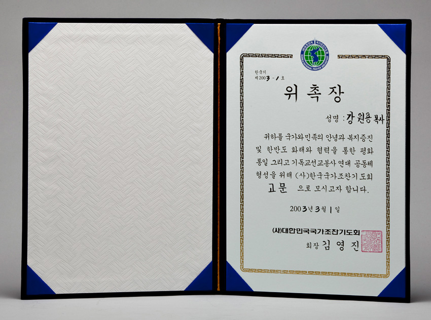 (사)대한민국국가조찬기도회 고문 위촉장 작성일 : 2011.06.29 조회수 : 30 공유하기 페이스북으로 공유하기 페이스북으로 공유하기 URL 귀하를 국가와 민족의 안녕과 복지증진 및 한반도 화해와 협력을 통한 평화 통일 그리고 기독교선교봉사 연대 공동체 형성을 위해 (사)한국국가조찬기도회 고문으로 모시고자 합니다. 관련일시 2003.03.01 태그 각종상패 이전 한신대 신입생을 위한 내일&리더십 캠프 다음 1차 멘토 포럼 목록으로