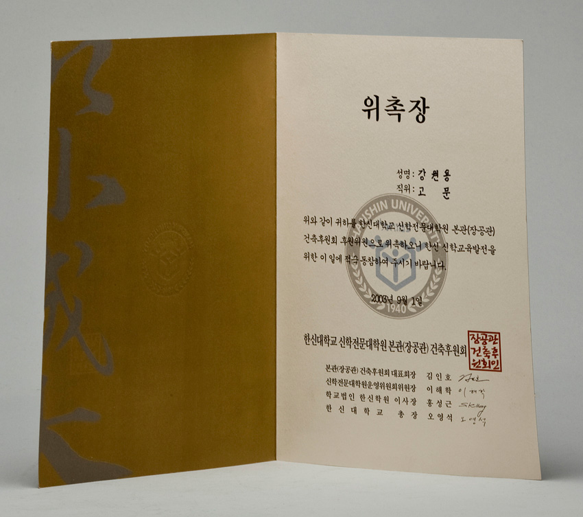 한신대학교 신학전문대학원 본관(장공관) 건축후원회 고문 위촉장 작성일 : 2011.06.29 조회수 : 32 공유하기 페이스북으로 공유하기 페이스북으로 공유하기 URL 위와 같이 귀하를 한신대학교 신학전문대학원 본관(장공관) 건축후원회 후원위원으로 위촉하오니 한신 신학교육발전을 위한 이 일에 적극 동참하여 주시기 바랍니다. 관련일시 2003.09.01 태그 각종상패 이전 한신대 신입생을 위한 내일&리더십 캠프 다음 1차 멘토 포럼 목록으로
