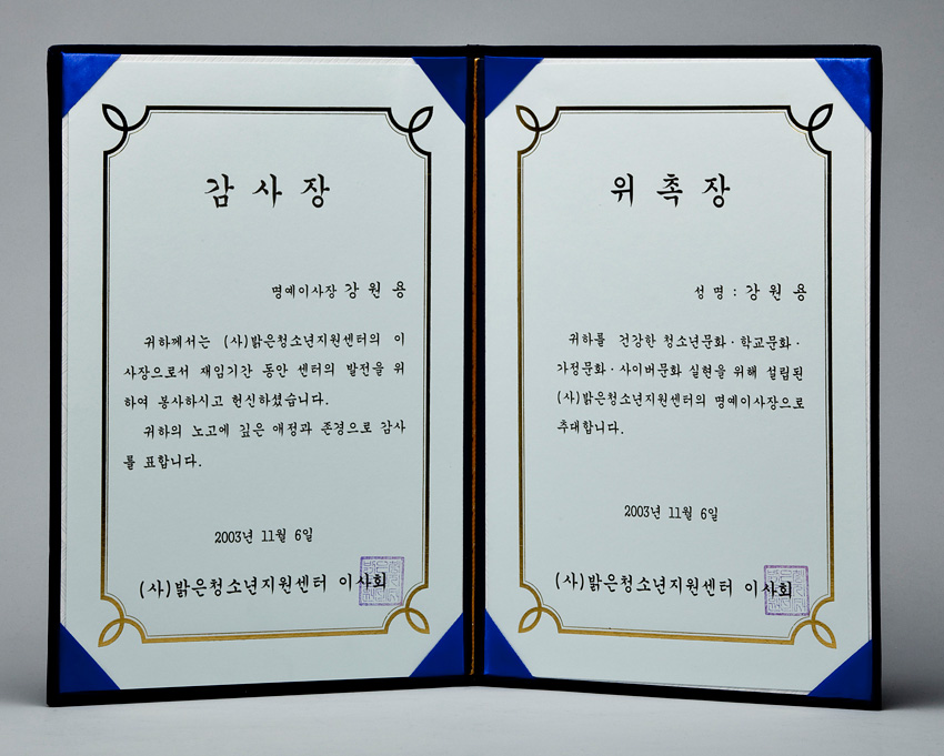 명예이사장 감사장 및 위촉장 - (사)밝은청소년지원센터 작성일 : 2011.06.29 조회수 : 66 공유하기 페이스북으로 공유하기 페이스북으로 공유하기 URL "(감사장) 귀하께서는 (사)밝은청소년지원센터의 이사장으로서 재임기간 동안 센터의 발전을 위하여 봉사하시고 헌신하셨습니다. 귀하의 노고에 깊은 애정과 존경으로 감사를 표합니다. (위촉장) 귀하를 건강한 청소년문화?학교문화?가정문화?사이버문화 실현을 위해 설립된 (사)밝은청소년지원센터의 명예이사장으로 추대합니다." 관련일시 2003.11.06 태그 각종상패 이전 한신대 신입생을 위한 내일&리더십 캠프 다음 1차 멘토 포럼 목록으로