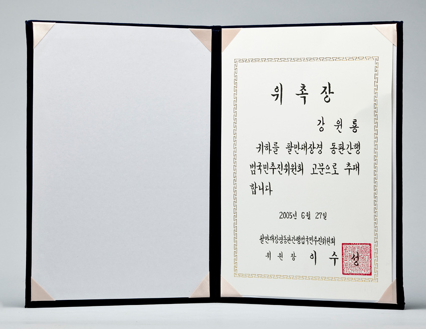 팔만대장경동판간행범국민추진위원회 고문 위촉장 작성일 : 2011.06.29 조회수 : 27 공유하기 페이스북으로 공유하기 페이스북으로 공유하기 URL 귀하를 팔만대장경 동판간행 범국민추진위원회 고문으로 추대합니다. 관련일시 2005.06.27 태그 각종상패 이전 한신대 신입생을 위한 내일&리더십 캠프 다음 1차 멘토 포럼 목록으로