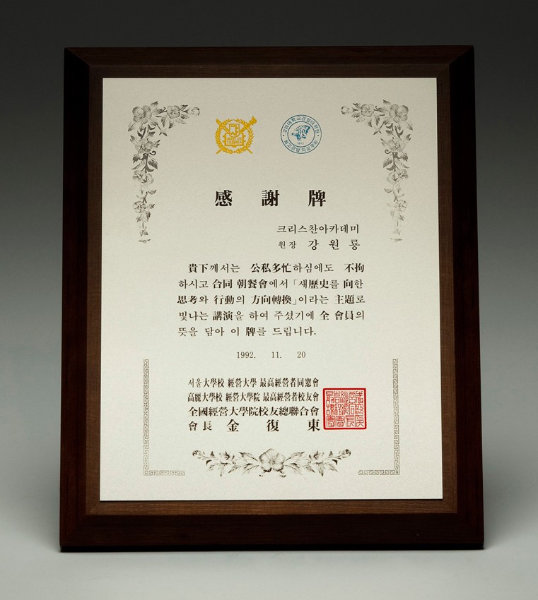귀하께서는 공사다망하심에도 불구하시고 합동 조찬회에서 「새역사를 향한 사고와 행동의 방향전환」이라는 주제로 빛나는 강연을 하여주셨기에 전 회원의 뜻을 담아 이 패를 드립니다.