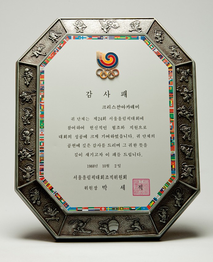 귀 단체는 제24회 서울올림픽대회에 참여하여 헌신적인 협조와 지원으로 대회의 성공에 크게 기여하였습니다. 귀 단체의 공헌에 깊은 감사를 드리며 그 귀한 뜻을 길이 새기고자 이 패를 드립니다.