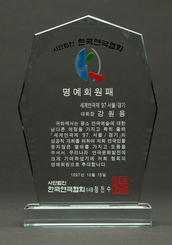 사단법인 한국연극협회 작성일 : 2011.06.29 조회수 : 21 공유하기 페이스북으로 공유하기 페이스북으로 공유하기 URL 귀하께서는 평소 연극예술에 대한 남다른 애정을 가지고 특히 올해 「세계 연극제 ‘99. 서울/경기」의 성공적 개최를 위하여 저희 연극인들 못지않은 열의를 가지고 도움을 주셔서 우리나라 연극문화발전에 크게 기여하셨기에 저희 협회의 명예회원으로 추대합니다 관련일시 1997.10.15 태그 각종상패 이전 한신대 신입생을 위한 내일&리더십 캠프 다음 1차 멘토 포럼 목록으로