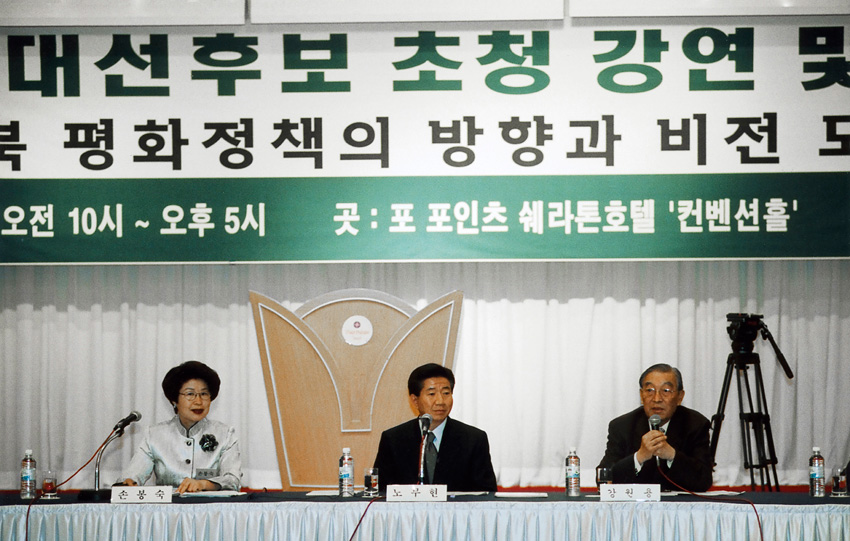 제16대 대선후보 초청강연 및 토론회-남북 평화정책의 방향과 비전 모색 작성일 : 2011.06.29 조회수 : 17 공유하기 페이스북으로 공유하기 페이스북으로 공유하기 URL 왼쪽부터 손봉숙, 노무현, 강원용 관련일시 2002.10.24 노트 포포인츠쉐라톤호텔 태그 평화포럼활동 이전 한신대 신입생을 위한 내일&리더십 캠프 다음 1차 멘토 포럼 목록으로