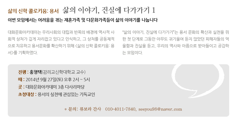 [사이너머 77호] 삶의 이야기, 진실에 다가가기 2014.09.19 조회수 : 42 공유하기 페이스북으로 공유하기 페이스북으로 공유하기 URL 이전 [사이너머 76호] 녹색의 힘을 어떻게 키워갈 것인가? 다음 [사이너머 78호] 우리는 행복한가? 목록으로