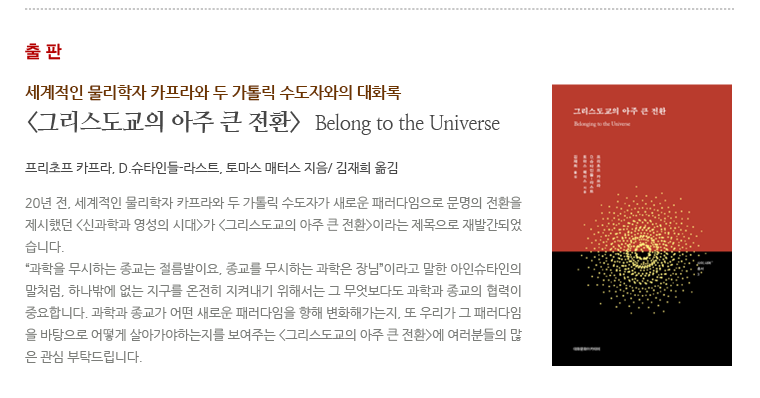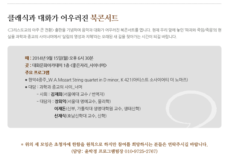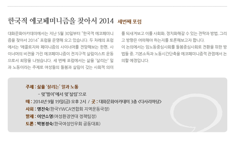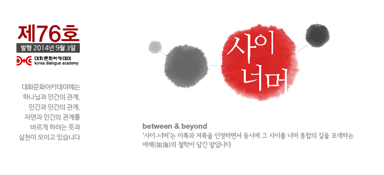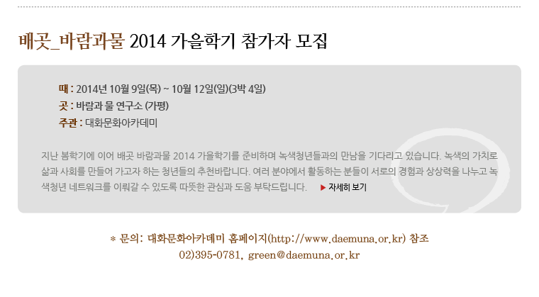 [사이너머 76호] 녹색의 힘을 어떻게 키워갈 것인가? 2014.09.04 조회수 : 41 공유하기 페이스북으로 공유하기 페이스북으로 공유하기 URL 이전 [사이너머 75호] 인간화 대화모임 민주화의 아이들 外 다음 [사이너머 77호] 삶의 이야기, 진실에 다가가기 목록으로