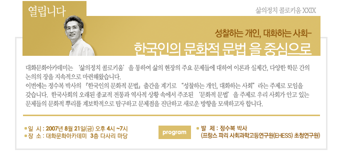 대화문화아카데미 사이·너머 뉴스레터(2007.08.01일자) 2007.11.05 조회수 : 21 공유하기 페이스북으로 공유하기 페이스북으로 공유하기 URL 이전 대화문화아카데미 사이·너머 뉴스레터(2007.06.28일자) 다음 사이*너머 11월호 목록으로