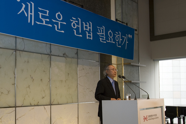 때: 2008년 7월 3일 곳:서울프라자호텔 다이아몬드홀 발제 : 대화모임 ’새로운 헌법 필요한가’의 쟁점과 접점 김재원 (성균관대 교수, 법학) 격려말씀 : 이만섭 (전 국회의장, 18대 국회미래한국헌법연구회 고문) 논평 : 김원기 (전 국회의장) 박관용 (전 국회의장) 김광웅 (서울대 명예교수, 시사IN 발행인) 임철순 (한국일보 주필)