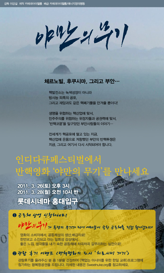대화문화아카데미 인디다큐페스티벌에서 '반핵영화' <야만의 무기>를 만나세요~ 2011.03.23 조회수 : 32 공유하기 페이스북으로 공유하기 페이스북으로 공유하기 URL 태그 야만의 무기핵폐기장핵폐기물핵발전소 이전 [모집] 3월 생태답사 - 도롱뇽아! 어디있니!? 다음 인드라망 수련프로그램 '쉼'이 4/22~24진행됩니다. 목록으로