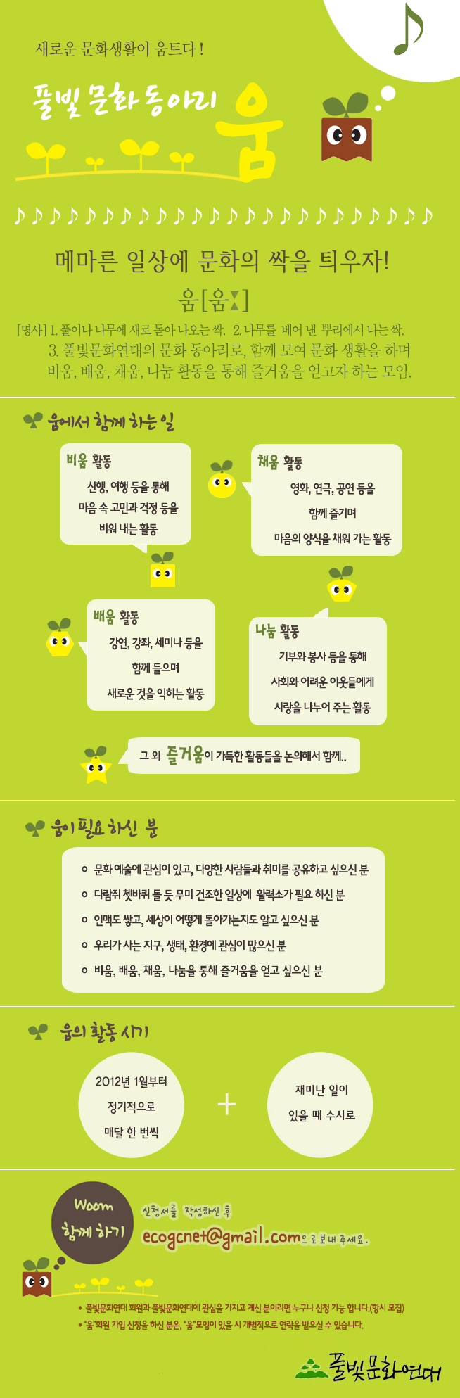 3. 풀빛문화연대의 문화동아리로, 함께 모여 문화생활을 하며 비움, 배움, 채움, 나눔 활동을 통해 즐거움을 얻고자 하는 모임.
