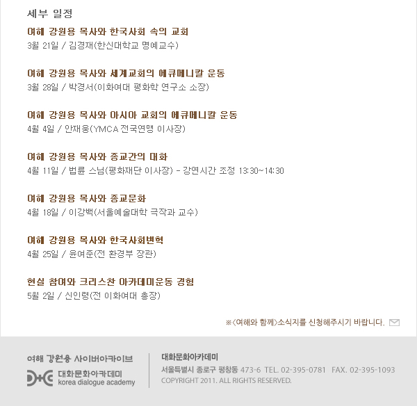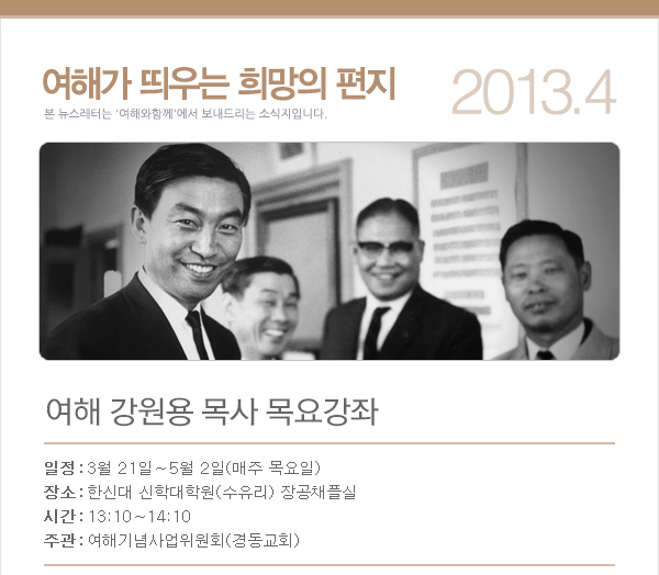 출판간행물 여해 강원용목사 목요 강좌에 초대합니다 2013.04.02 조회수 : 48 공유하기 페이스북으로 공유하기 페이스북으로 공유하기 URL 태그 강원용목요강좌 이전 경동 여해 강좌- 내가 믿는 부활 다음 배곳 바람과물 2013 봄학기 안내 목록으로