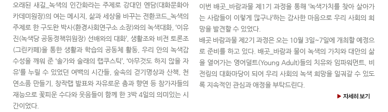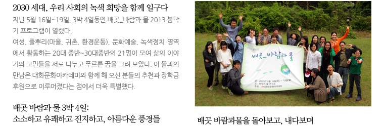 [사이너머 71호] 녹색 희망을 일구는 배곳 바람과물 2013.05.31 조회수 : 38 공유하기 페이스북으로 공유하기 페이스북으로 공유하기 URL 이전 [사이너머70호] 2012년에 보내주신 큰 성원에 감사드립니다 다음 [사이너머 72호] WCC총회를 앞두고 열린 에큐매니칼 포럼 목록으로
