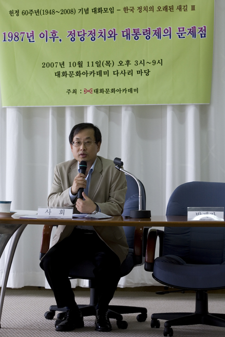 1987년 이후, 정당정치와 대통령제의 문제점 작성일 : 2007.10.11 조회수 : 39 공유하기 페이스북으로 공유하기 페이스북으로 공유하기 URL 때: 2007년 10월 11일 대화문화아카데미 발제 : 박명림 (연세대 지역학 협동과정 교수) 정윤재 (한국학중앙연구원 교수) 관련일시 2007.10.11 태그 2007 한국 정치의 오래된 새길 이전 인간의 권력의지에 대하여 - 왜 인간은 힘을 숭배하는가? 다음 진안군 마을만들기 목록으로